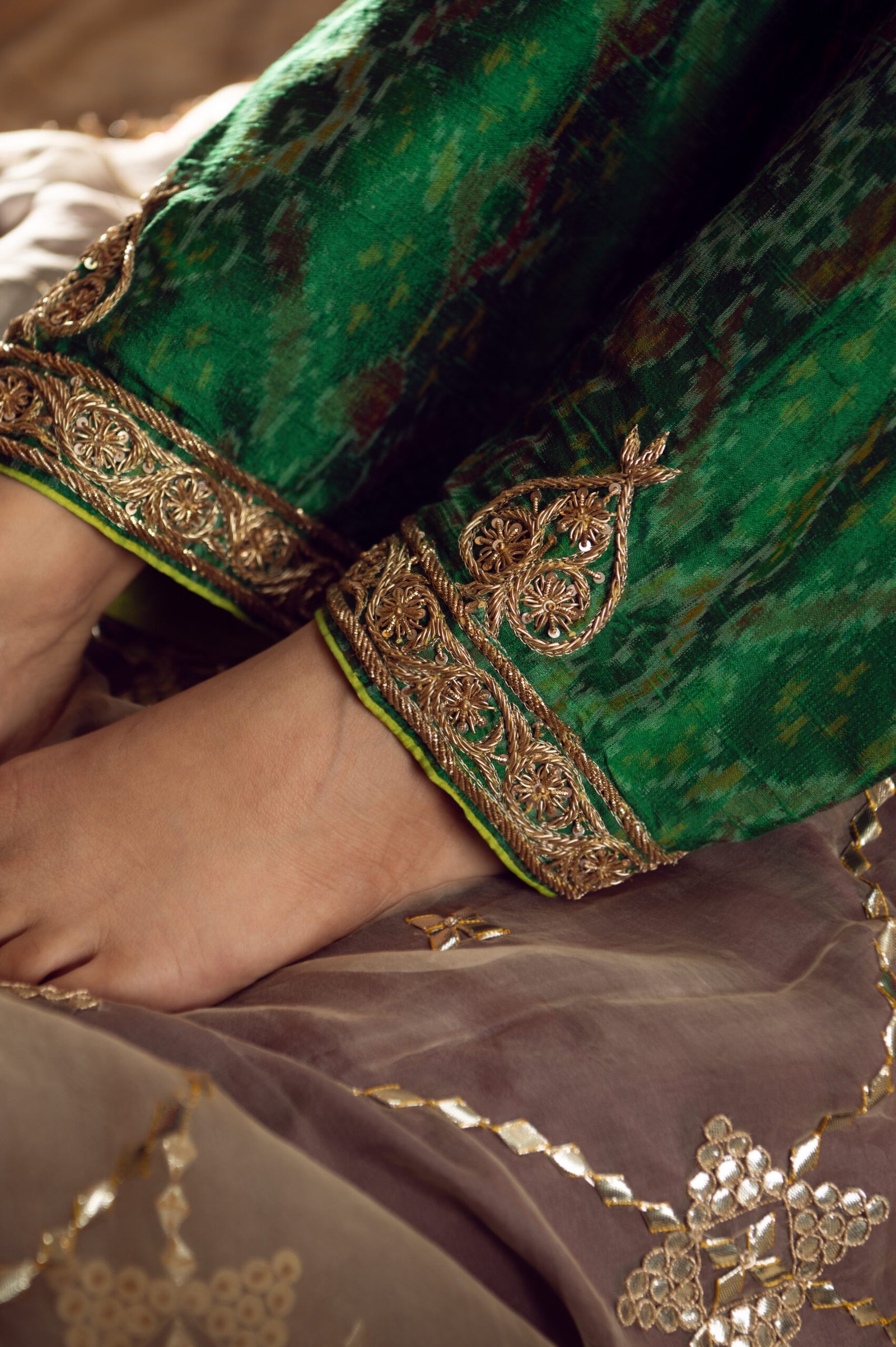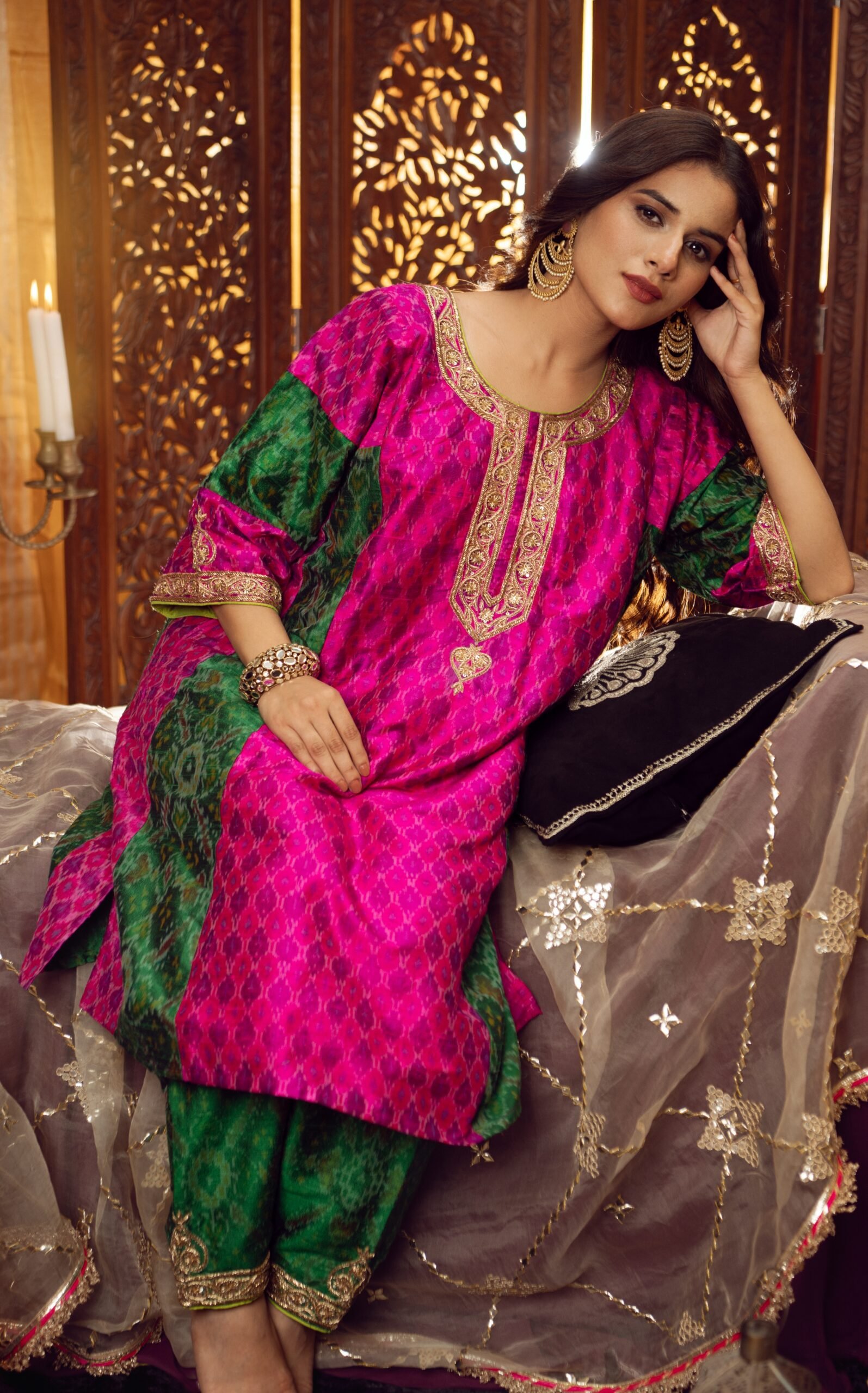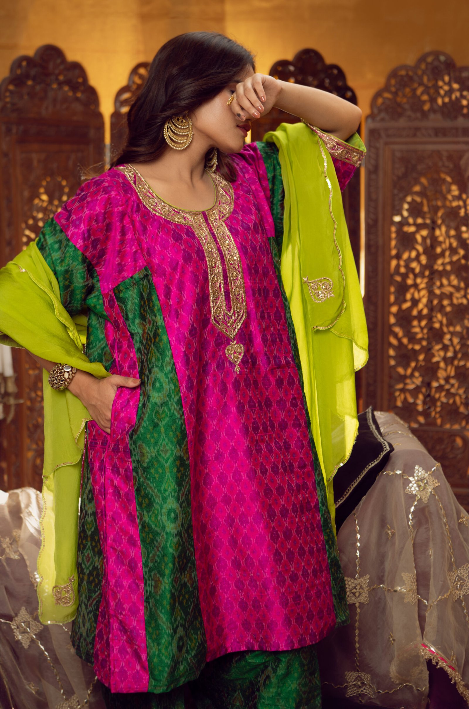 This phiran set is in pure hand woven raw silk ikat kurta and salwaar with pure silk organza dupatta