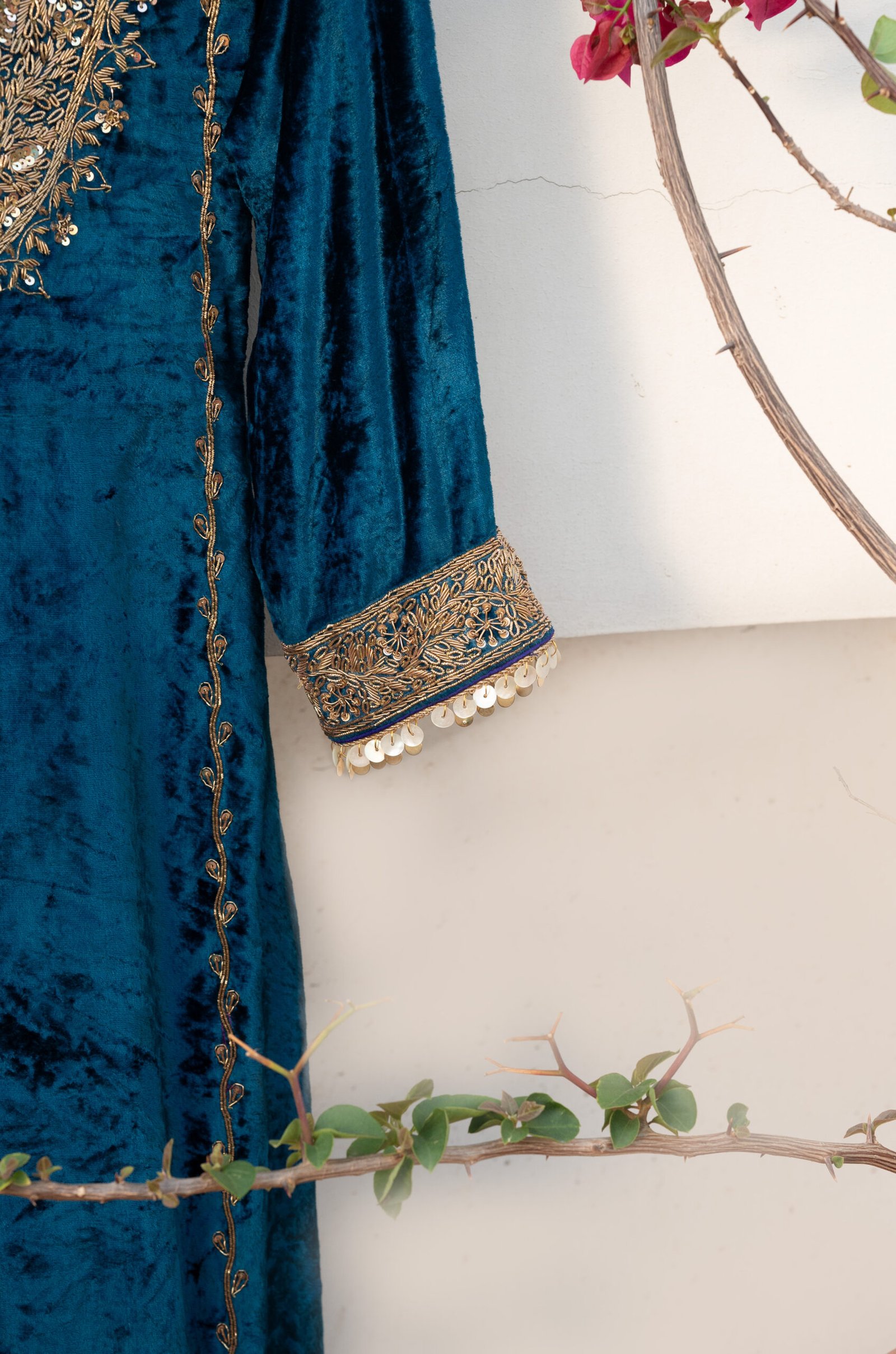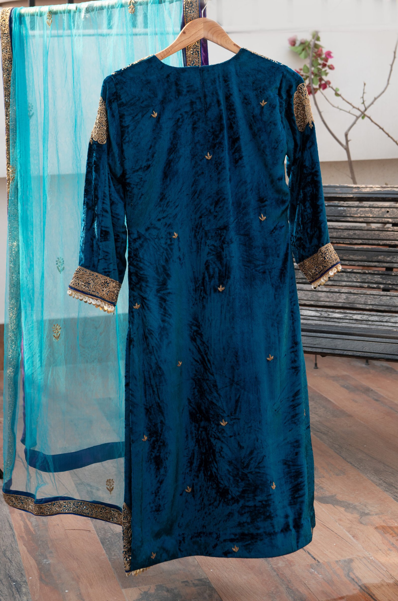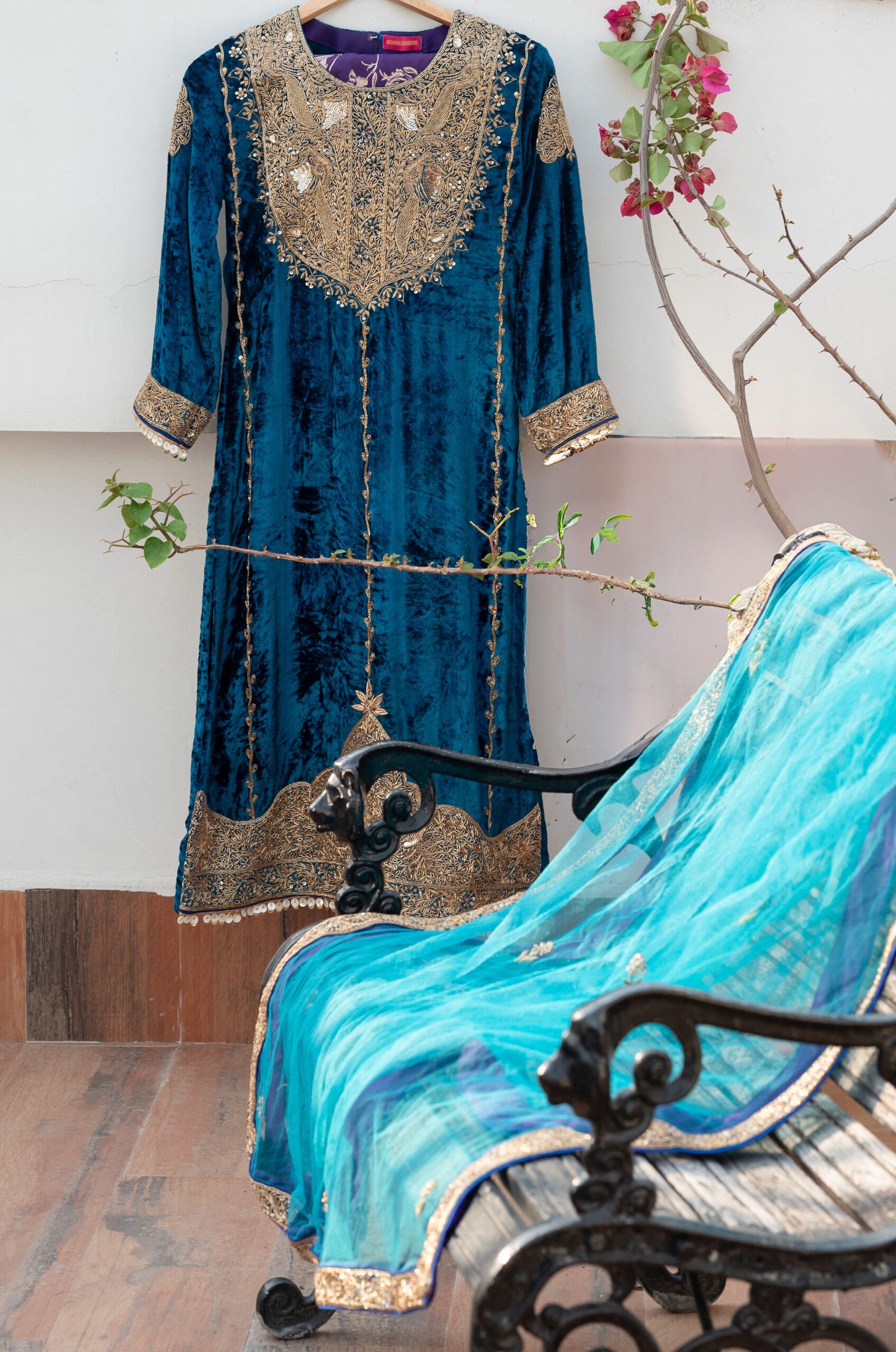 This hand embroidered zardozi kurta comes with churidar and embroidered dupatta.