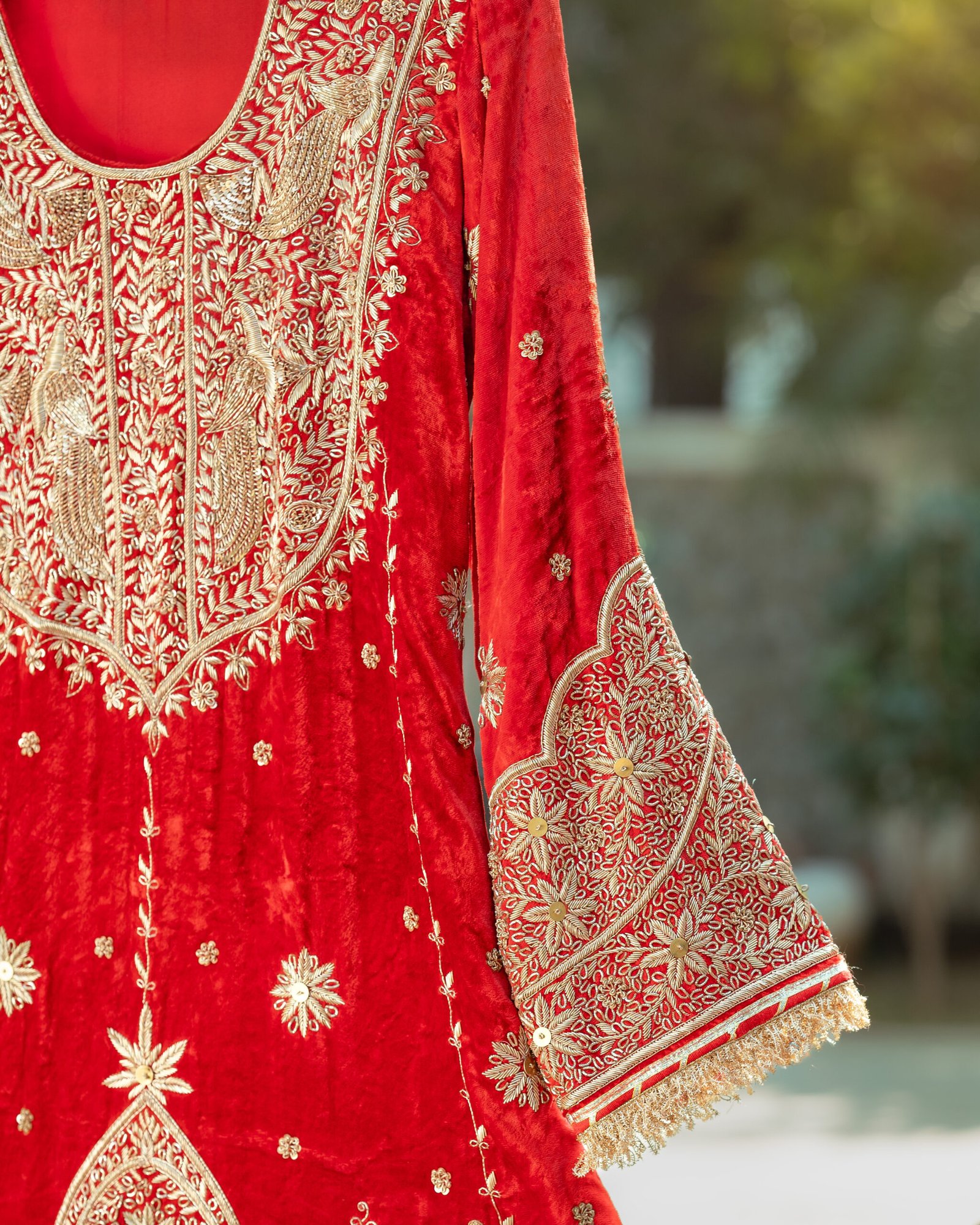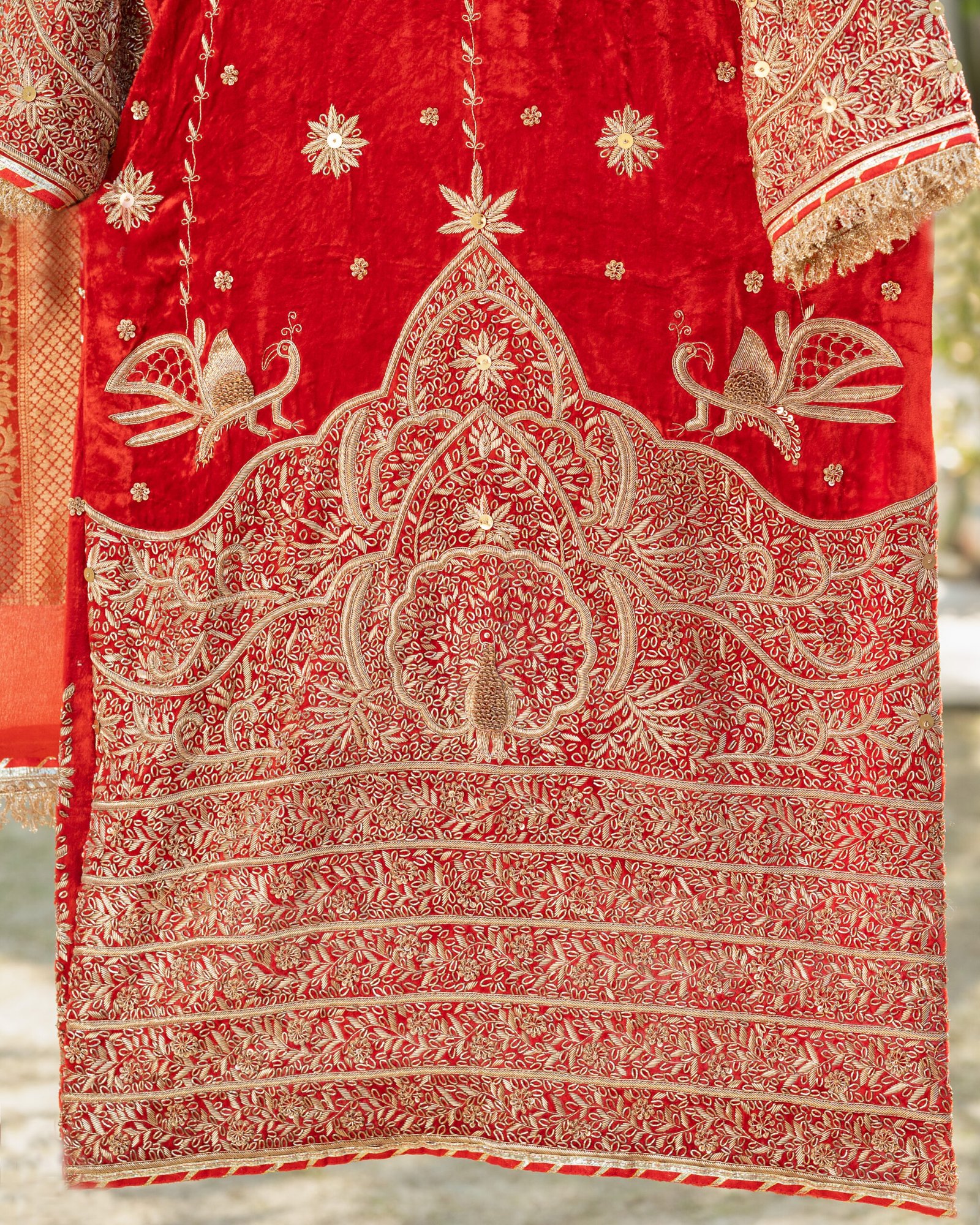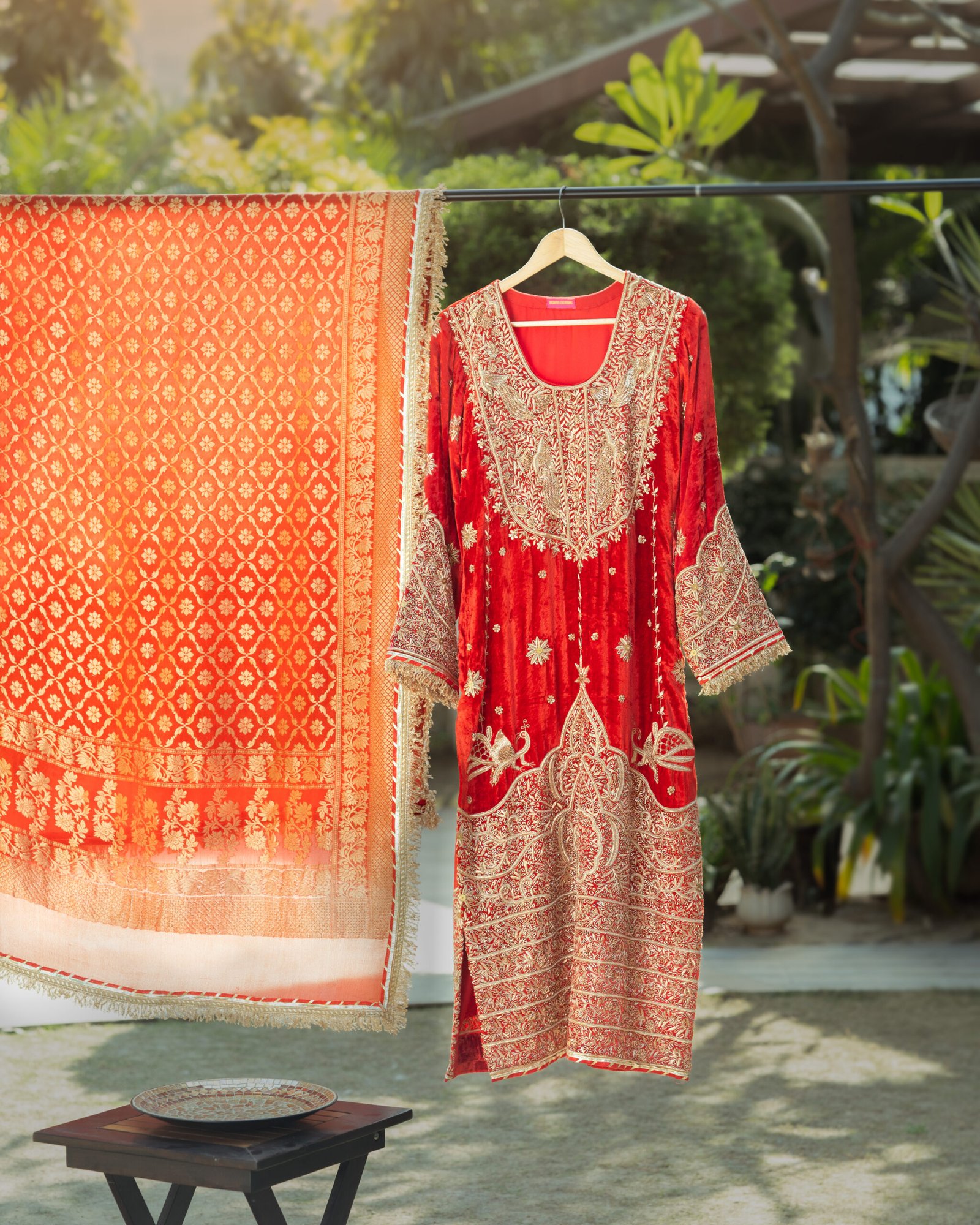 This hand embroidered zardozi kurta comes with red churidar and banarsi dupatta.