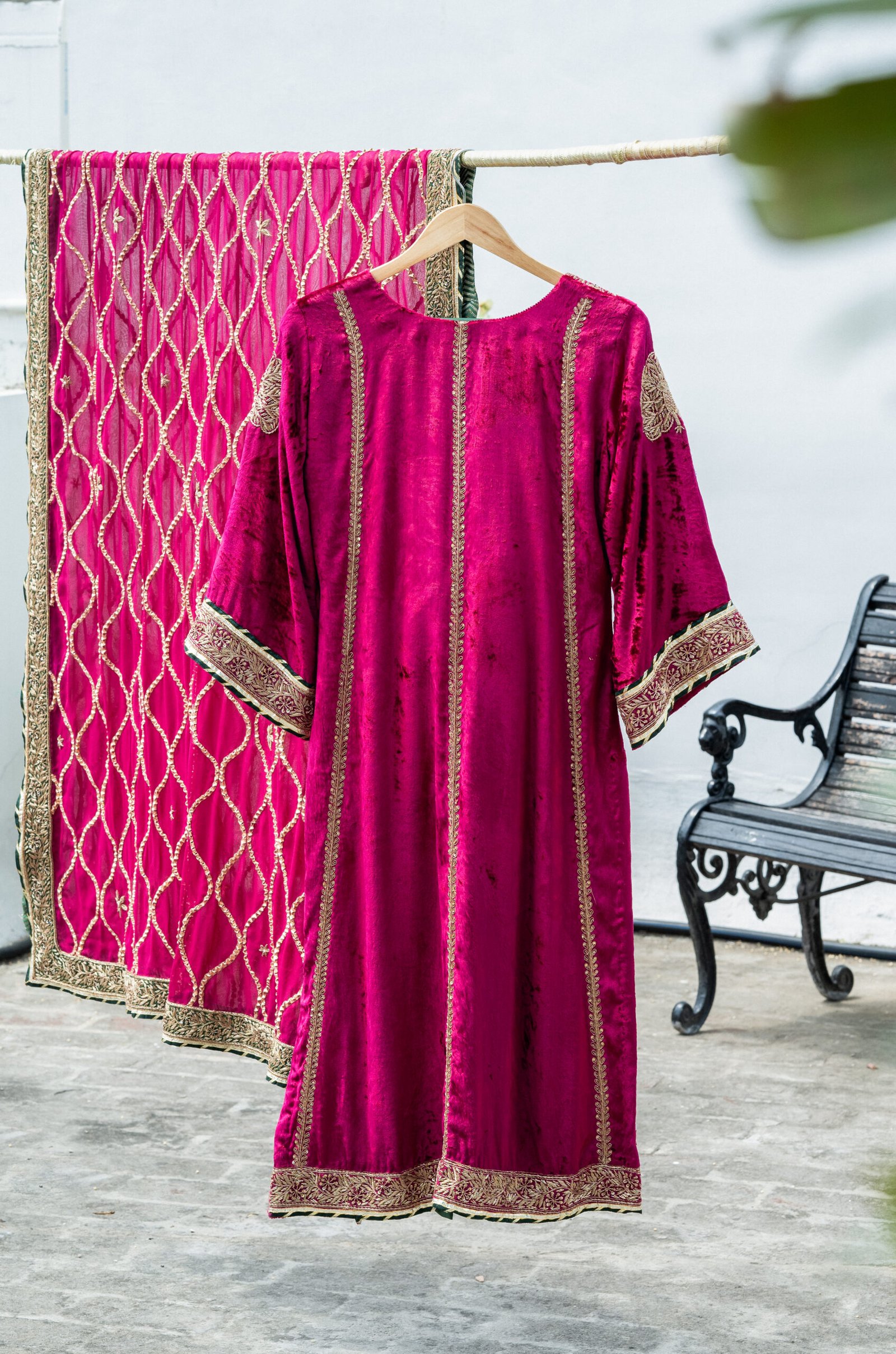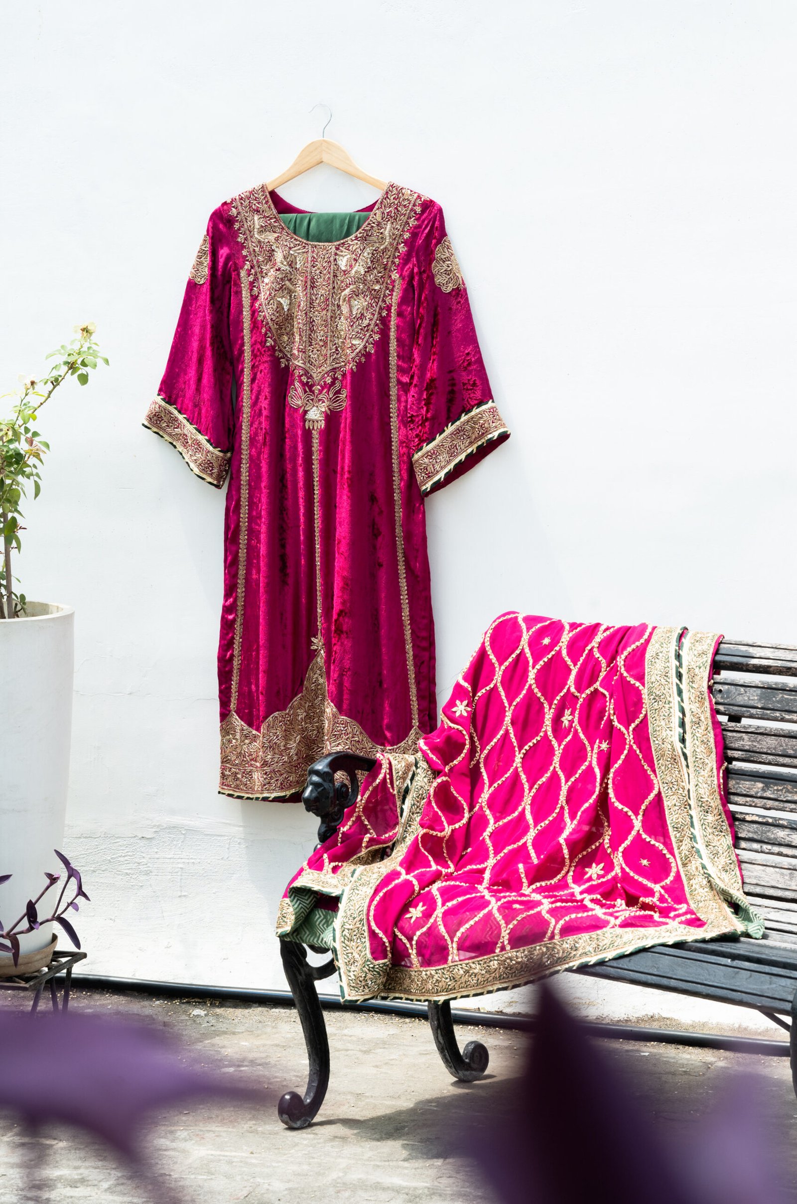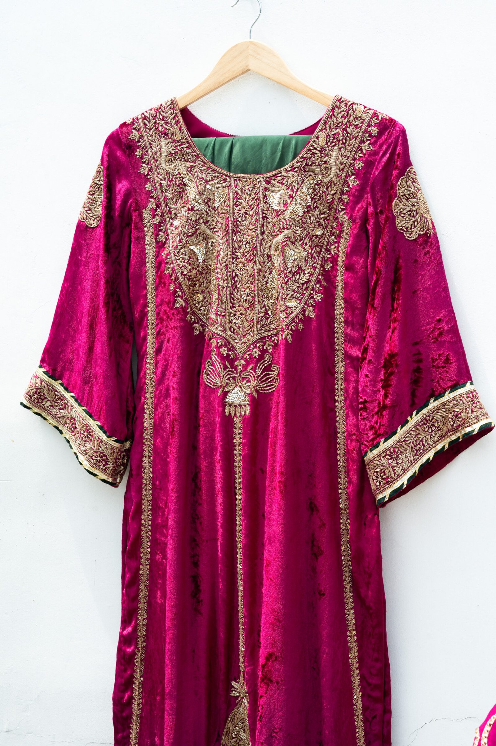 This hand embroidered zardozi kurta comes with green churidar and dupatta with gota and zardozi work.