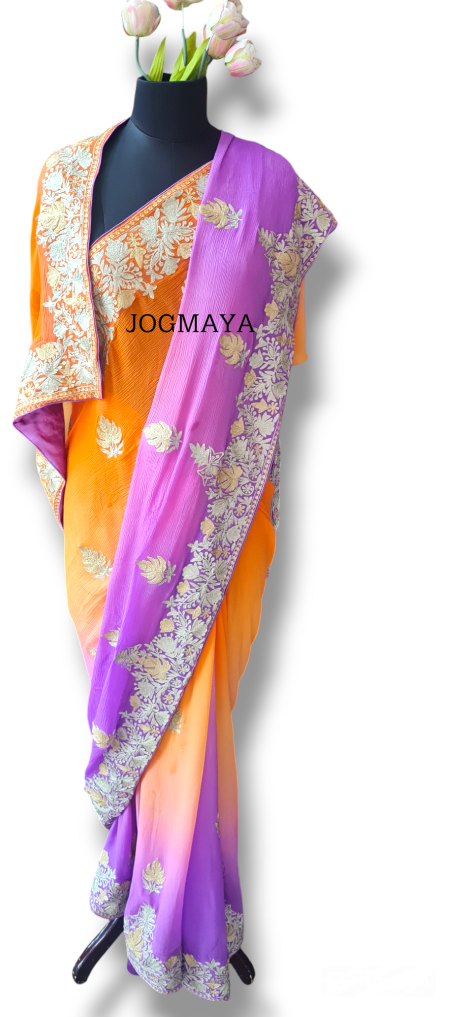 The Sunset Splendor Saree is a refined choice for those seeking a touch of grace and sophistication in their wardrobe. This exquisite piece captures the breathtaking beauty of a sunset, characterized by its stunning shades of lilac and orange.