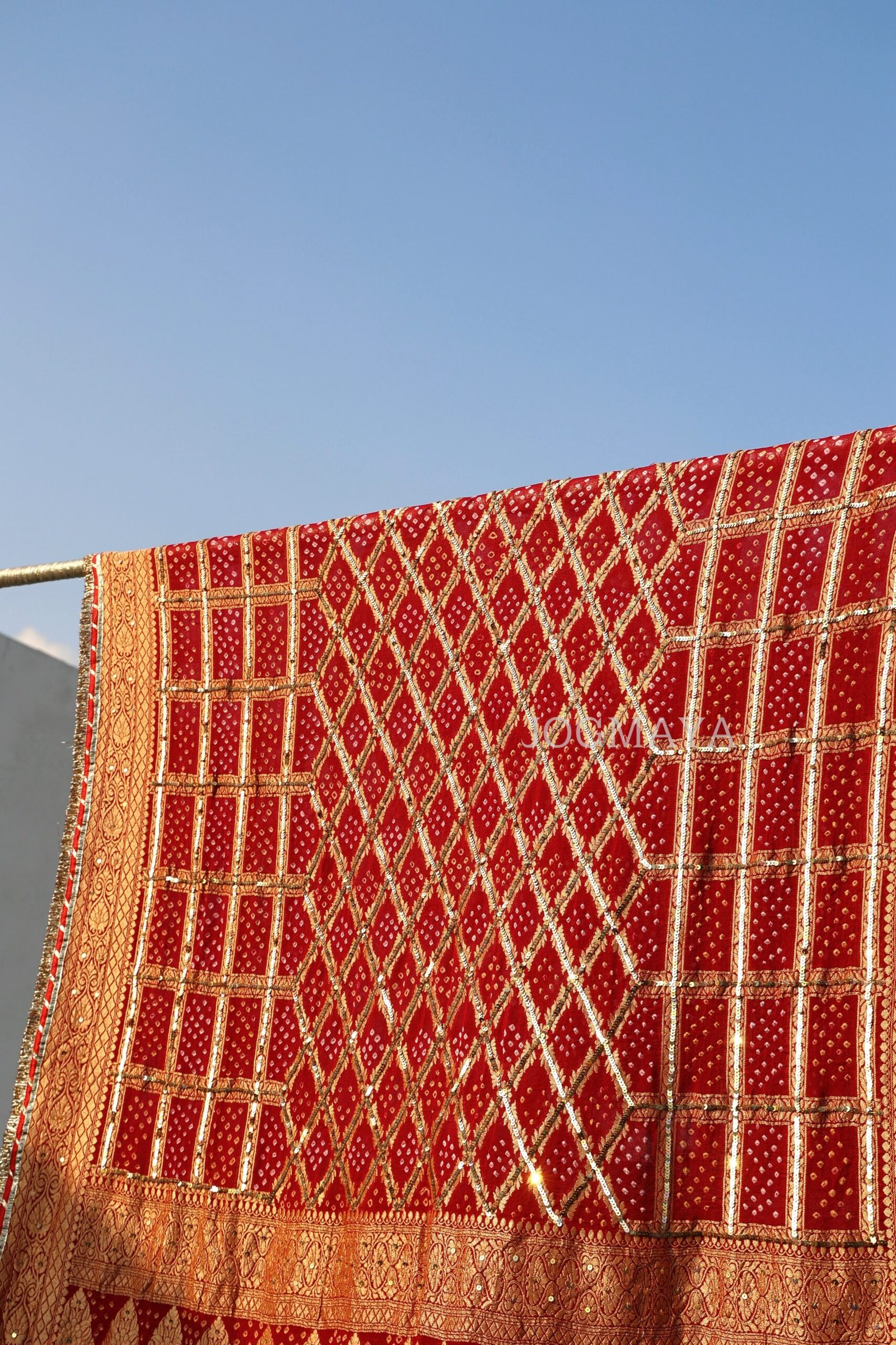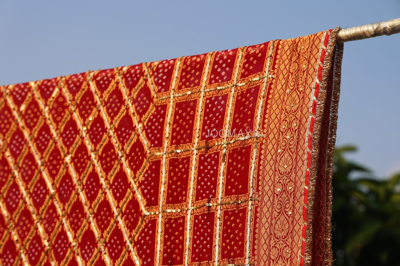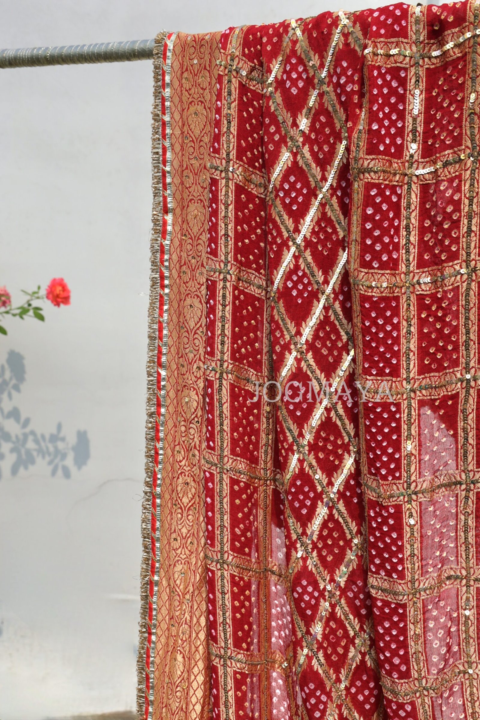 Elevate your festive and wedding ensembles with this Pure Georgette Bandhani Dupatta, crafted in timeless elegance. The dupatta features intricate neemzari weaving and sequin embroidered details, adding a subtle shimmer that beautifully complements the vibrant red base. Traditional Bandhani tie-dye patterns meet delicate zari work, making it a perfect blend of heritage and modern sophistication.