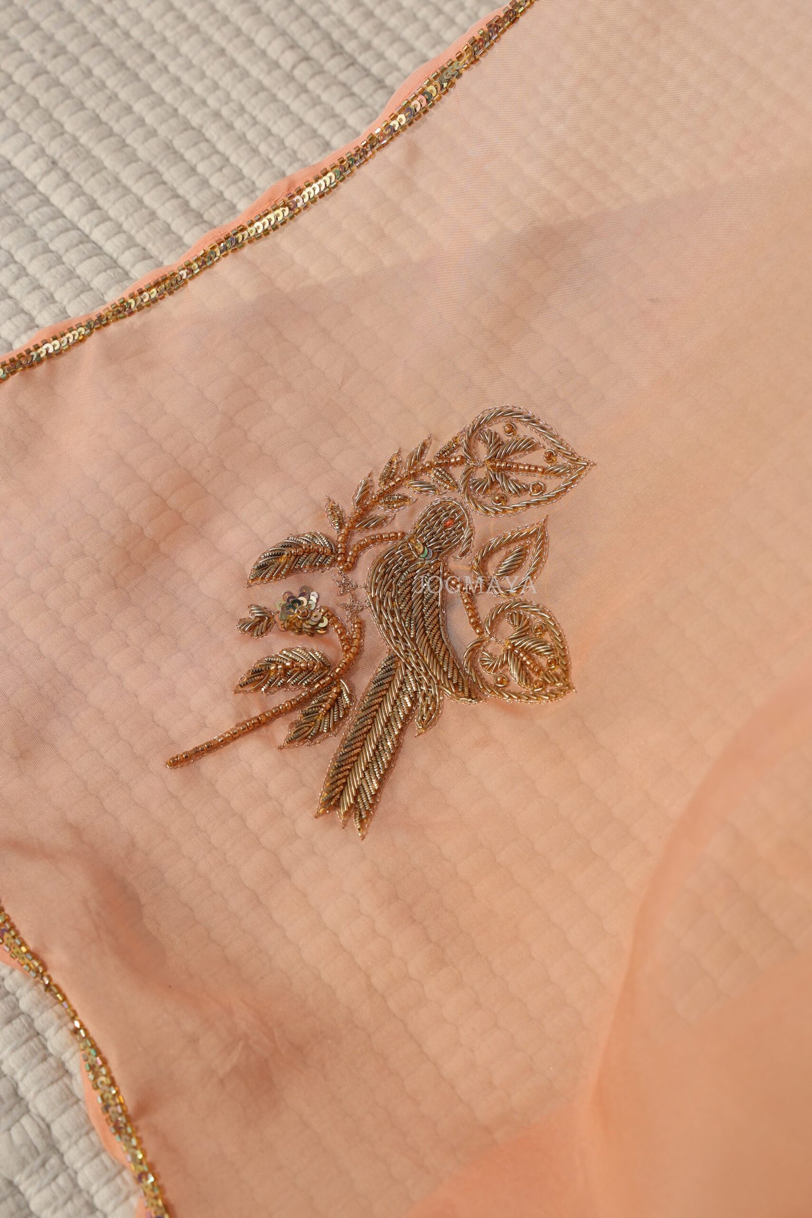 Our manika Ensemble features a luxurious woven pure khinkhwab phiran in soft blush tones paired with a dreamy organza dupatta embellished with delicate hand-embroidered zardozi motifs.