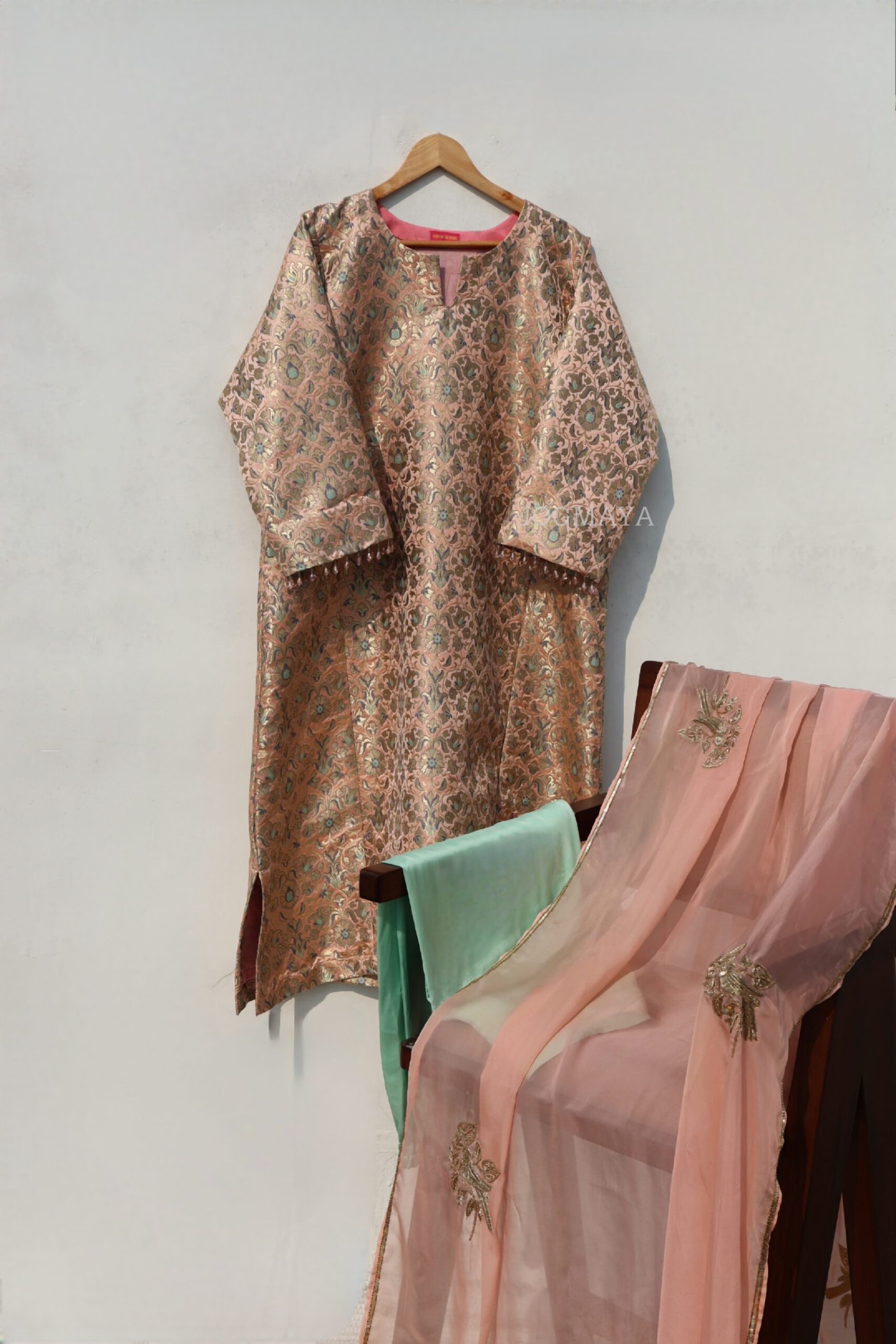 Fabric: Pure Khinkhwab, modal pants and organza hand embroidered dupatta.