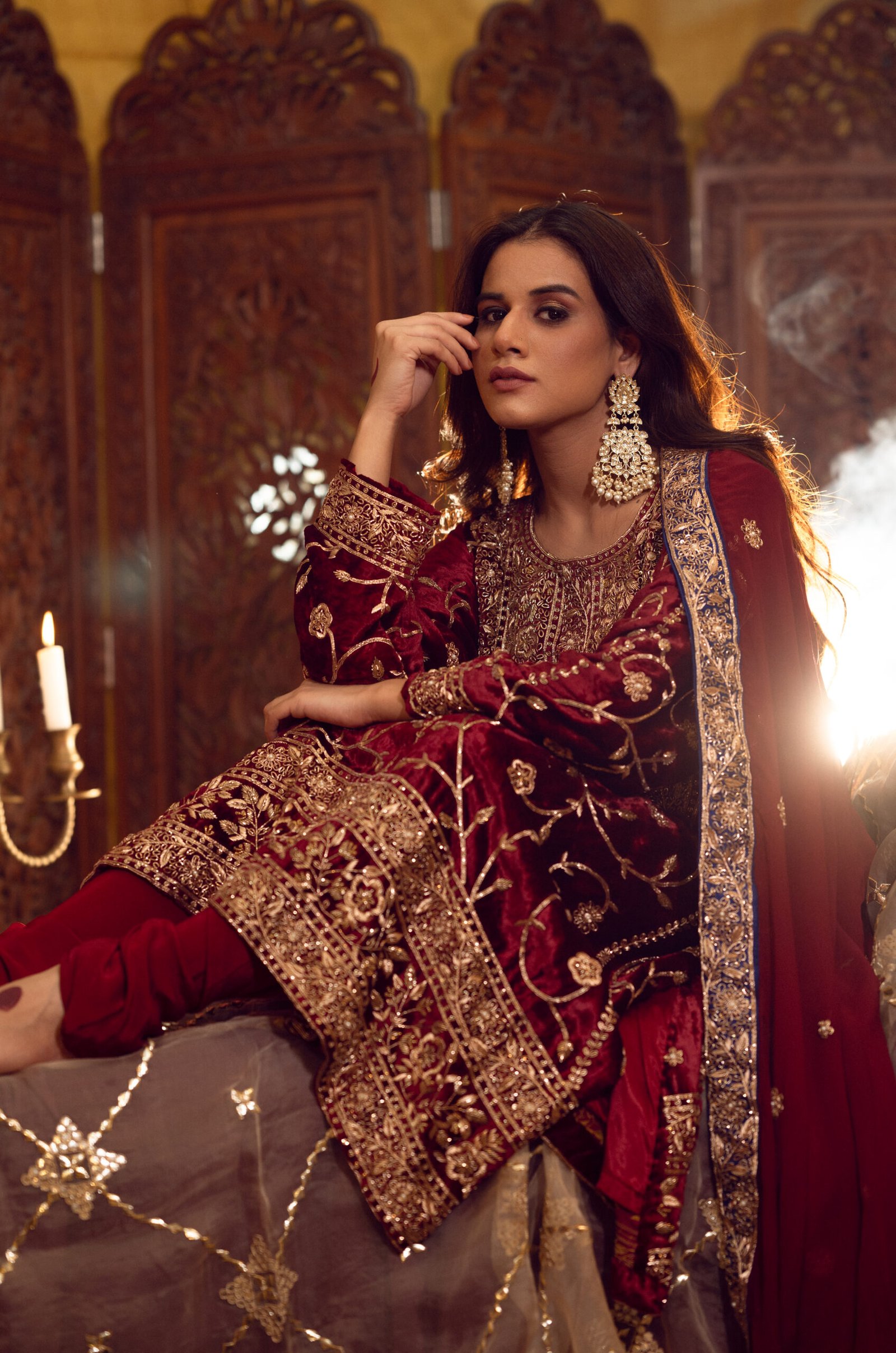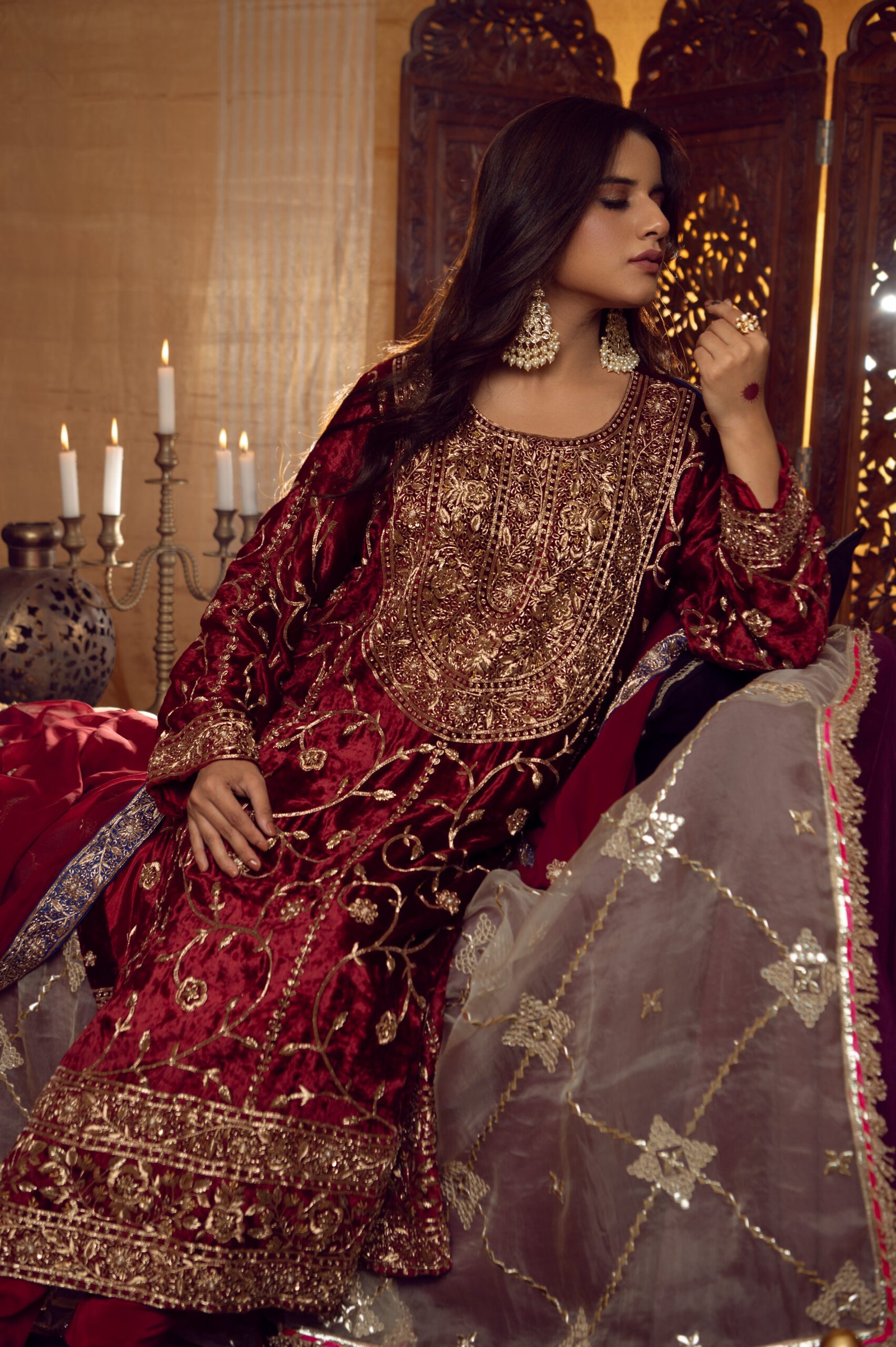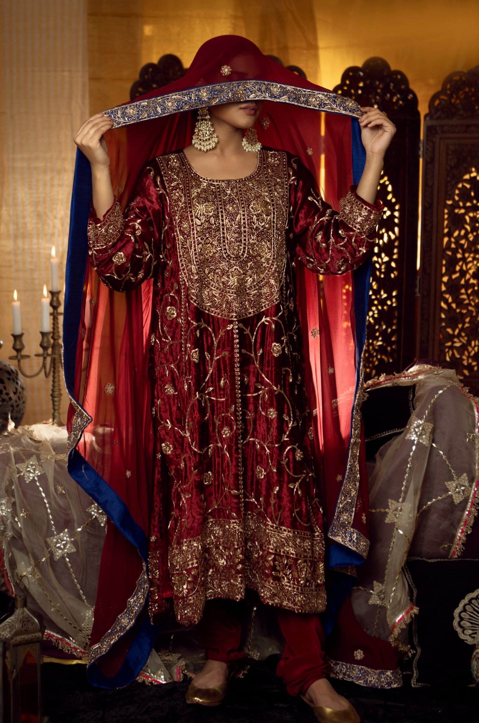 This hand embroidered zardozi kurta comes with maroon churidar and dupatta.
