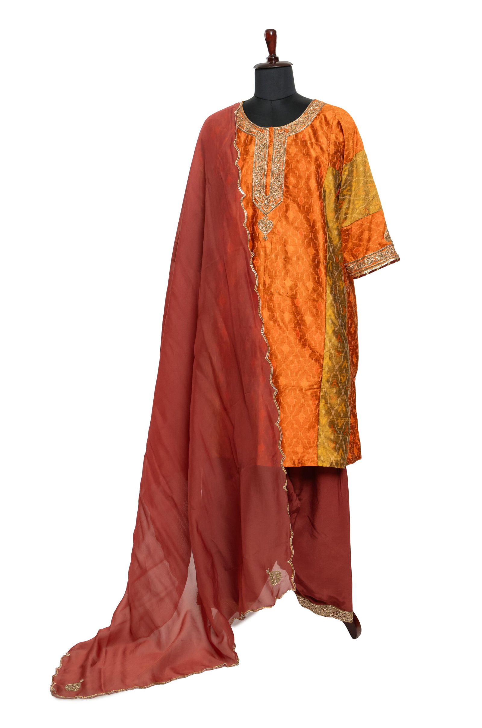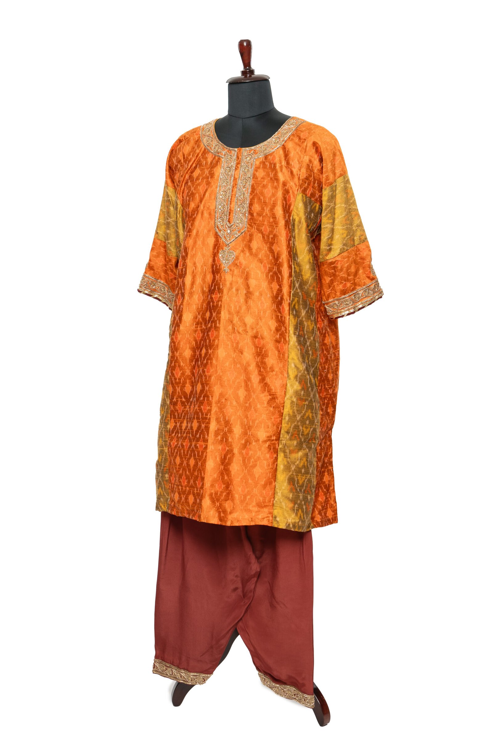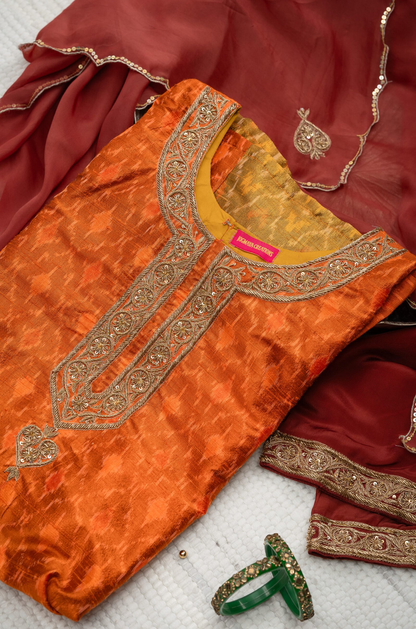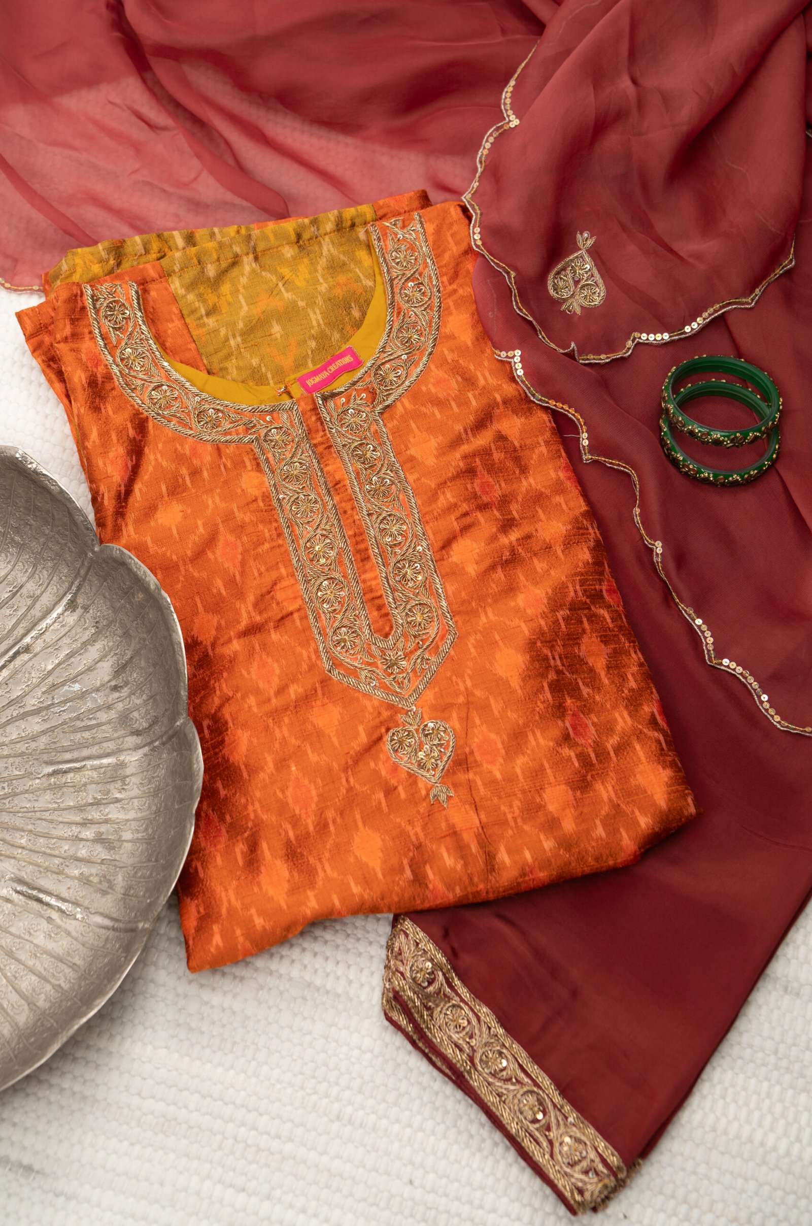 This phiran set is in pure hand woven raw silk ikat with pure silk organza dupatta and crepe salwaar