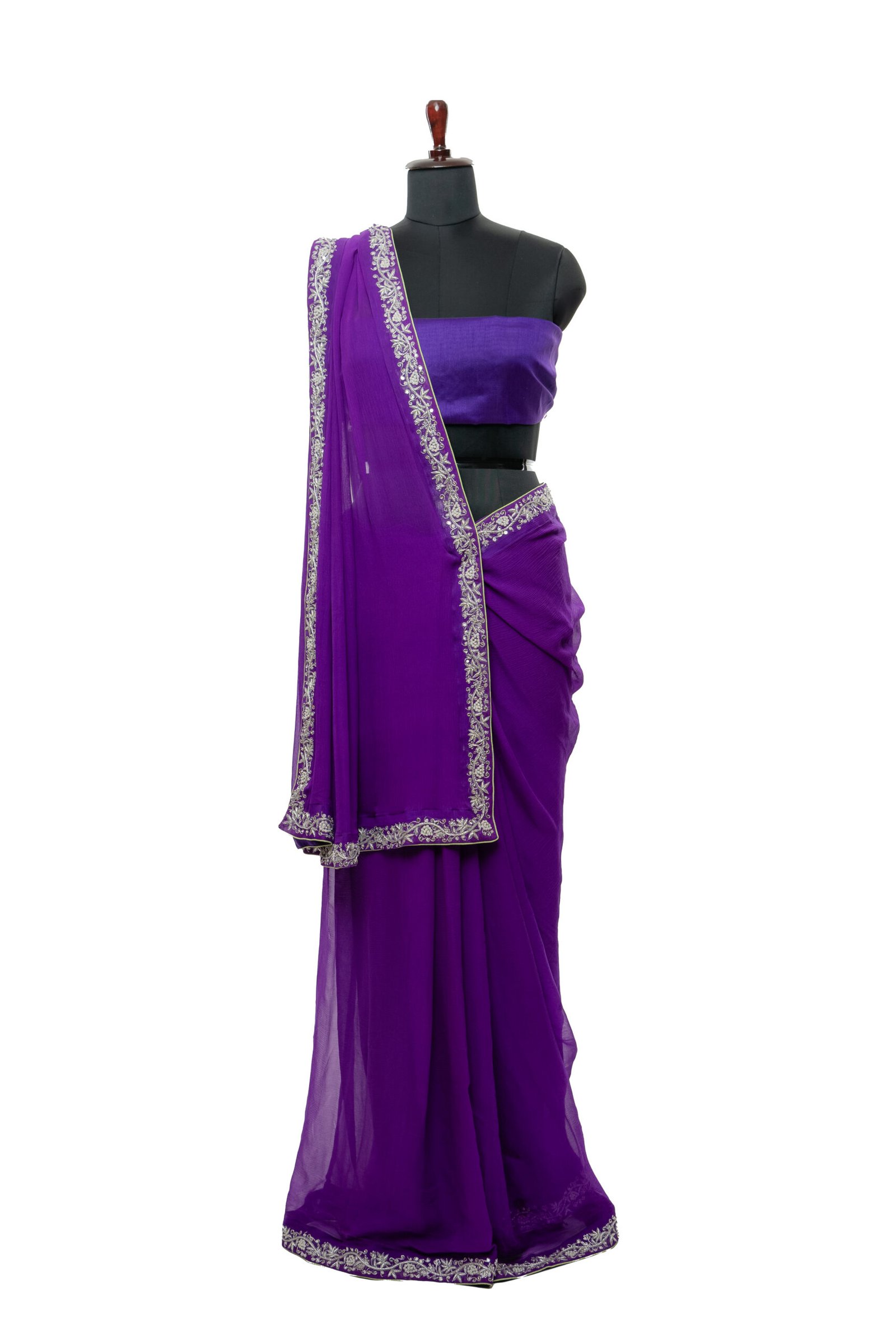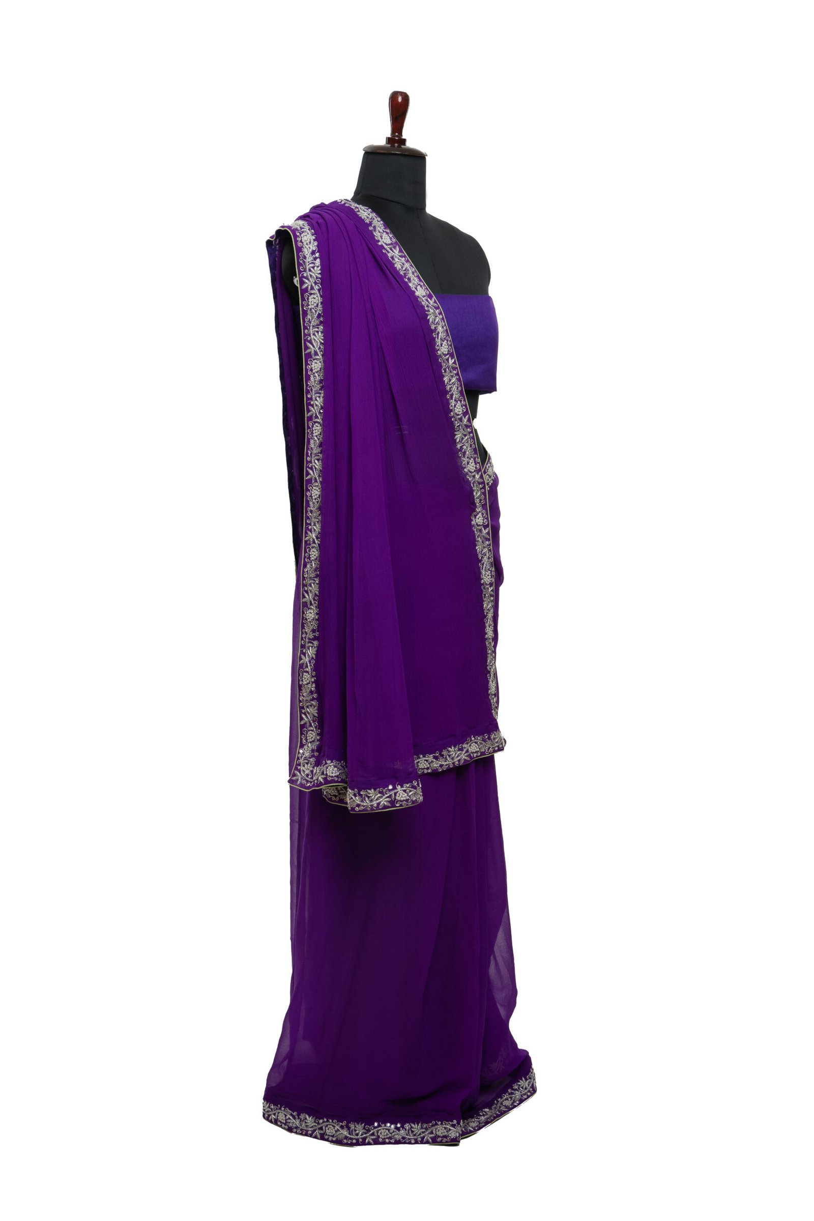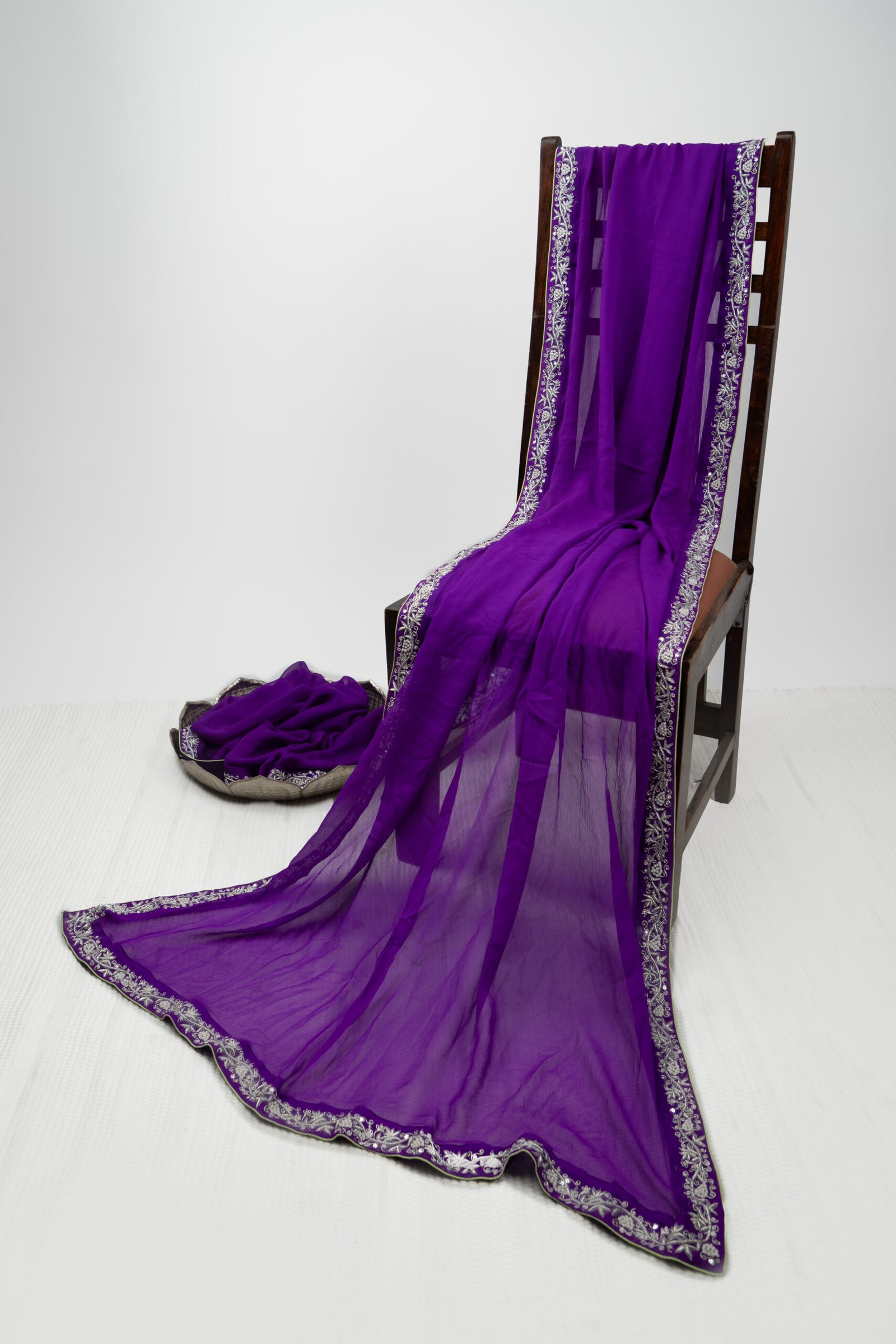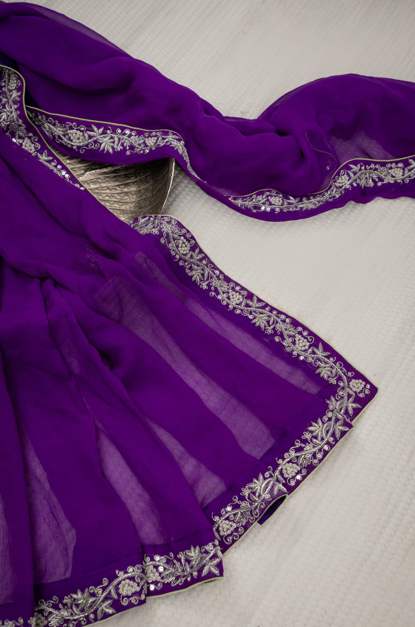 Elevate your elegance with this pure platinum chiffon saree, handcrafted with intricate Zardosi embroidery. The Grape ‘n’ Wine Creeper design adds a touch of sophistication, while the lovely aubergine shade exudes luxury. This stunning saree is lightweight and ensures comfort, while the intricate embroidery  craftsmanship. Make a statement with this and own the spotlight