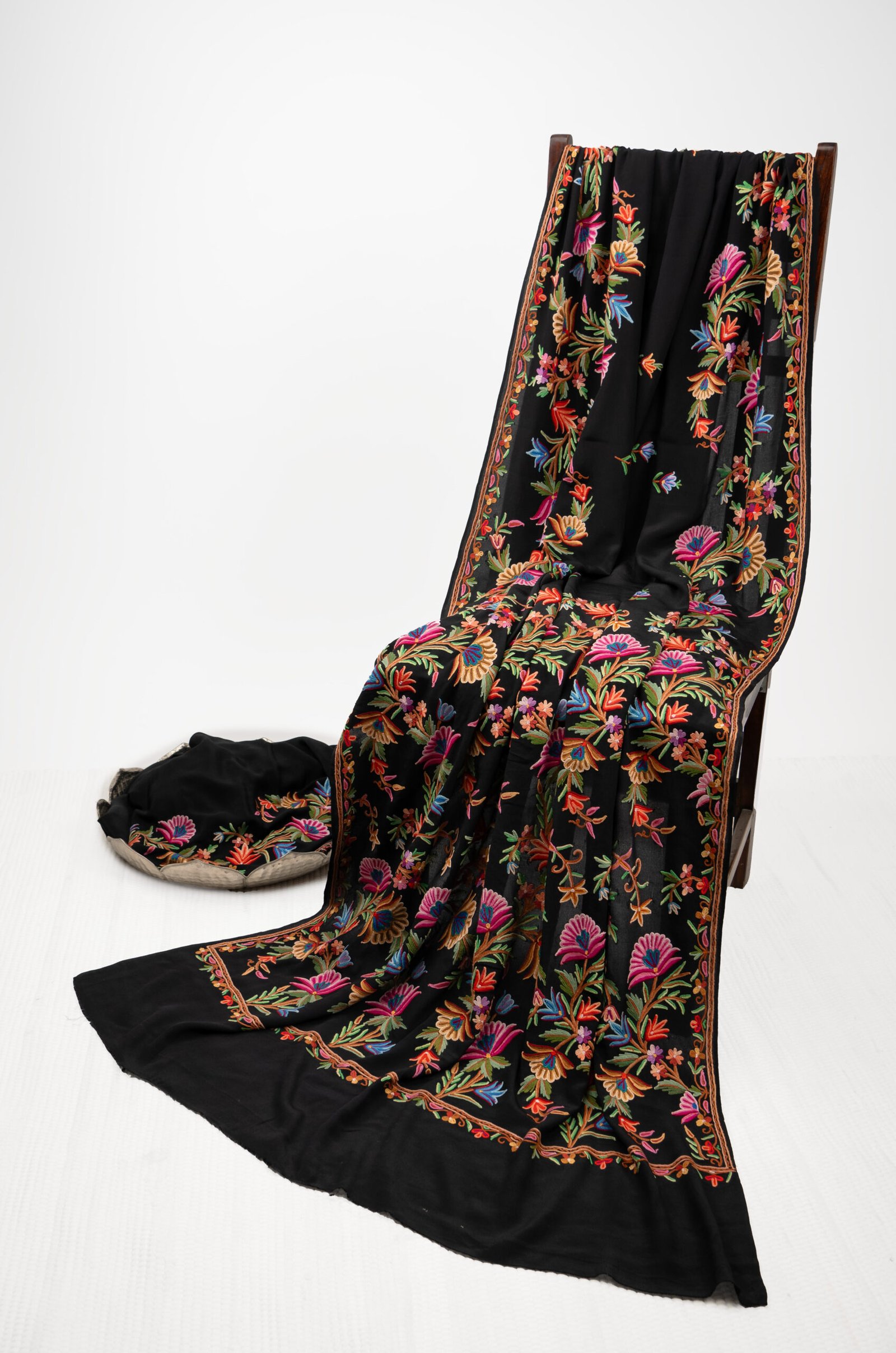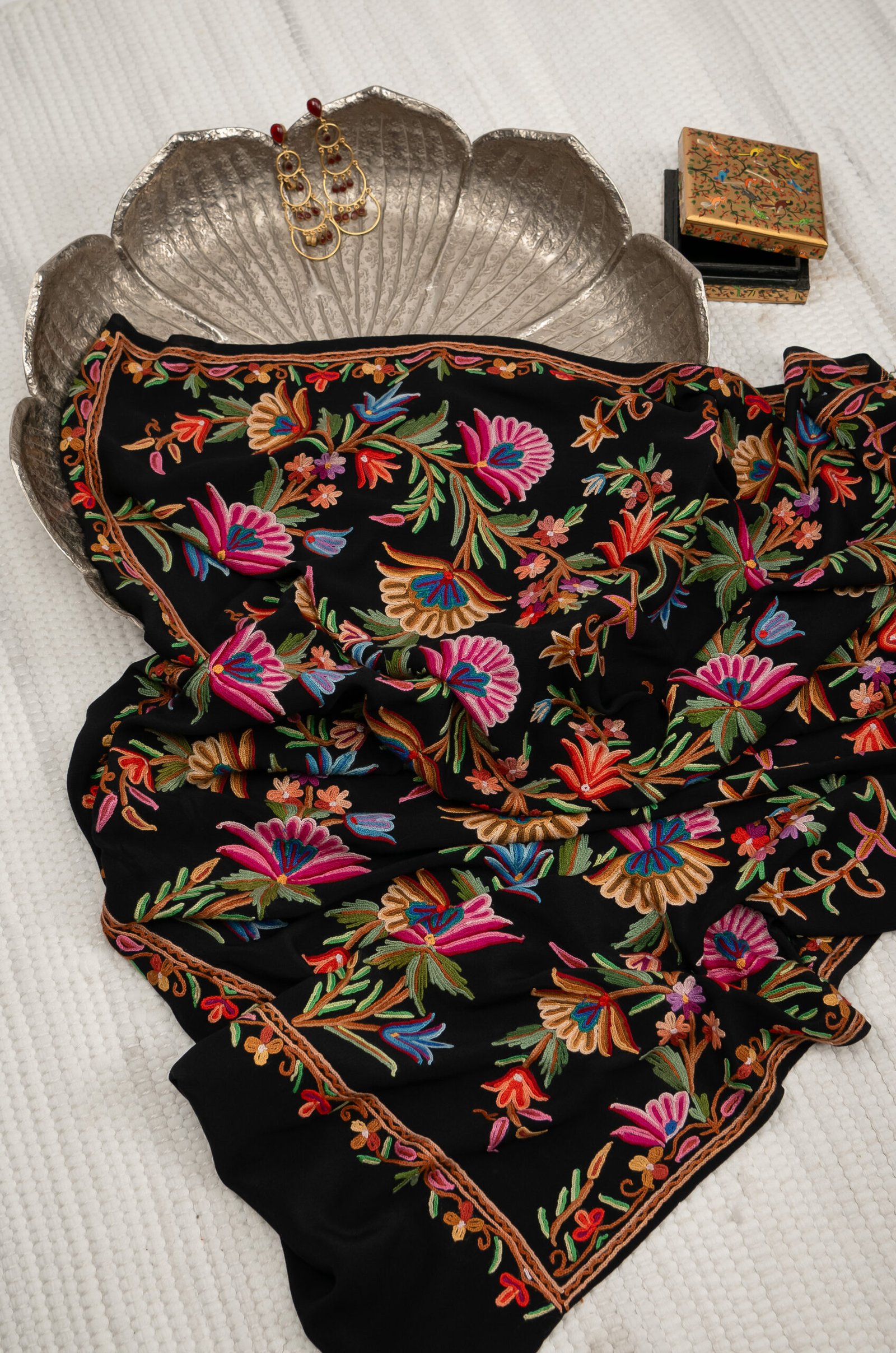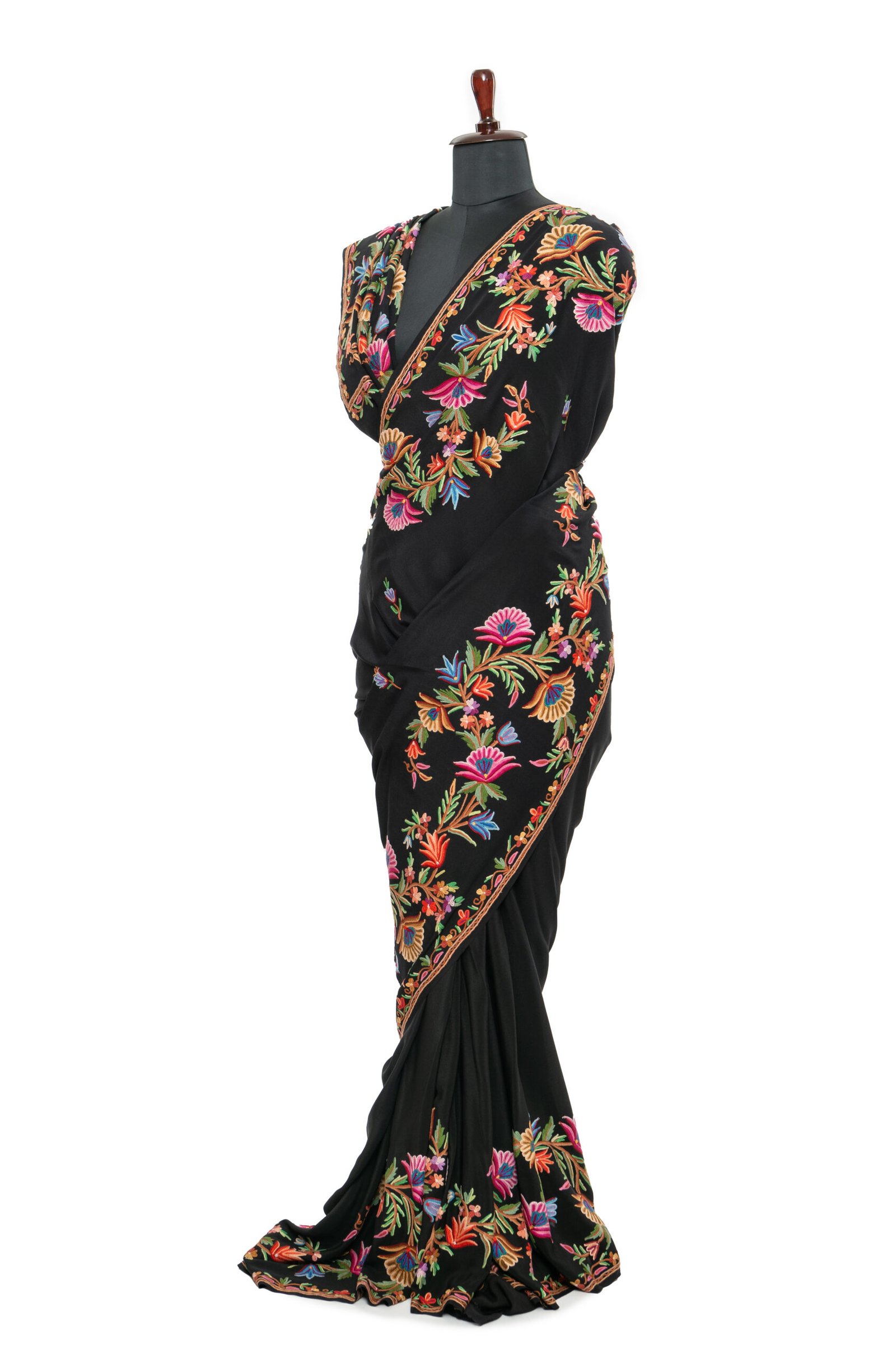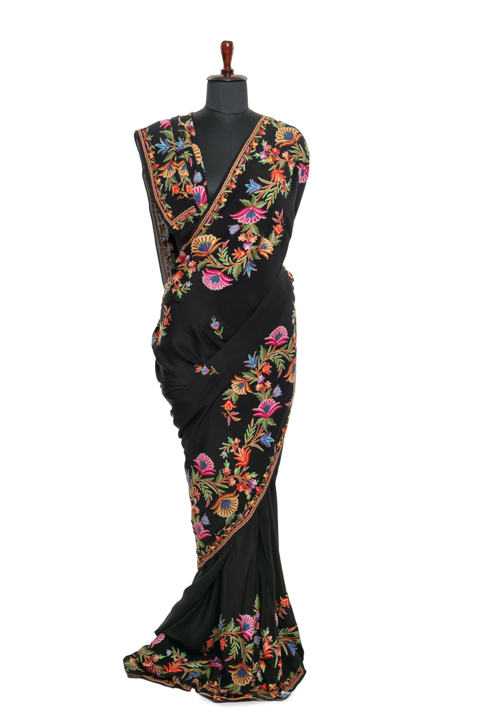 Drape yourself in elegance with this stunning black pure crepe hand-embroidered saree with