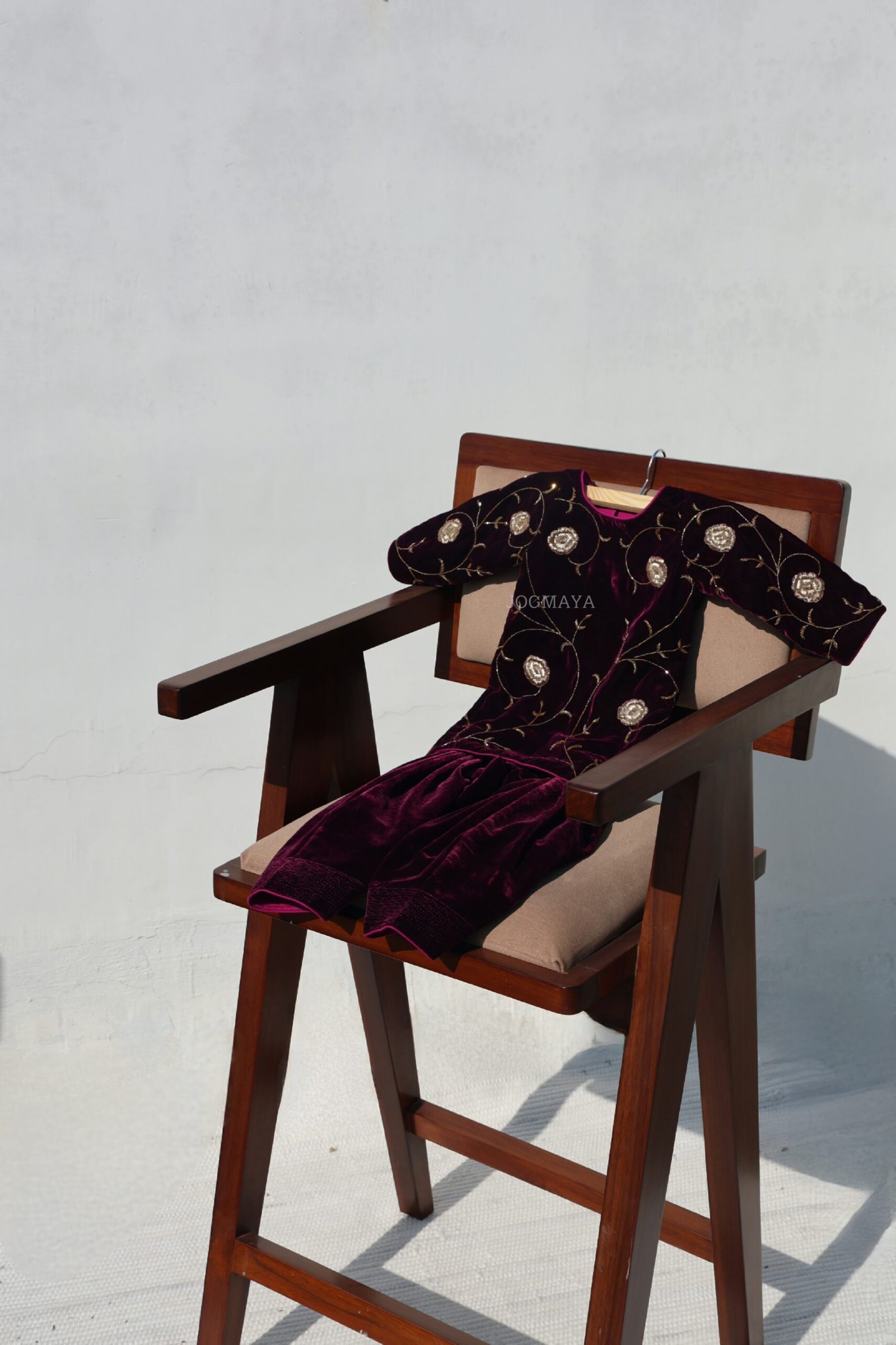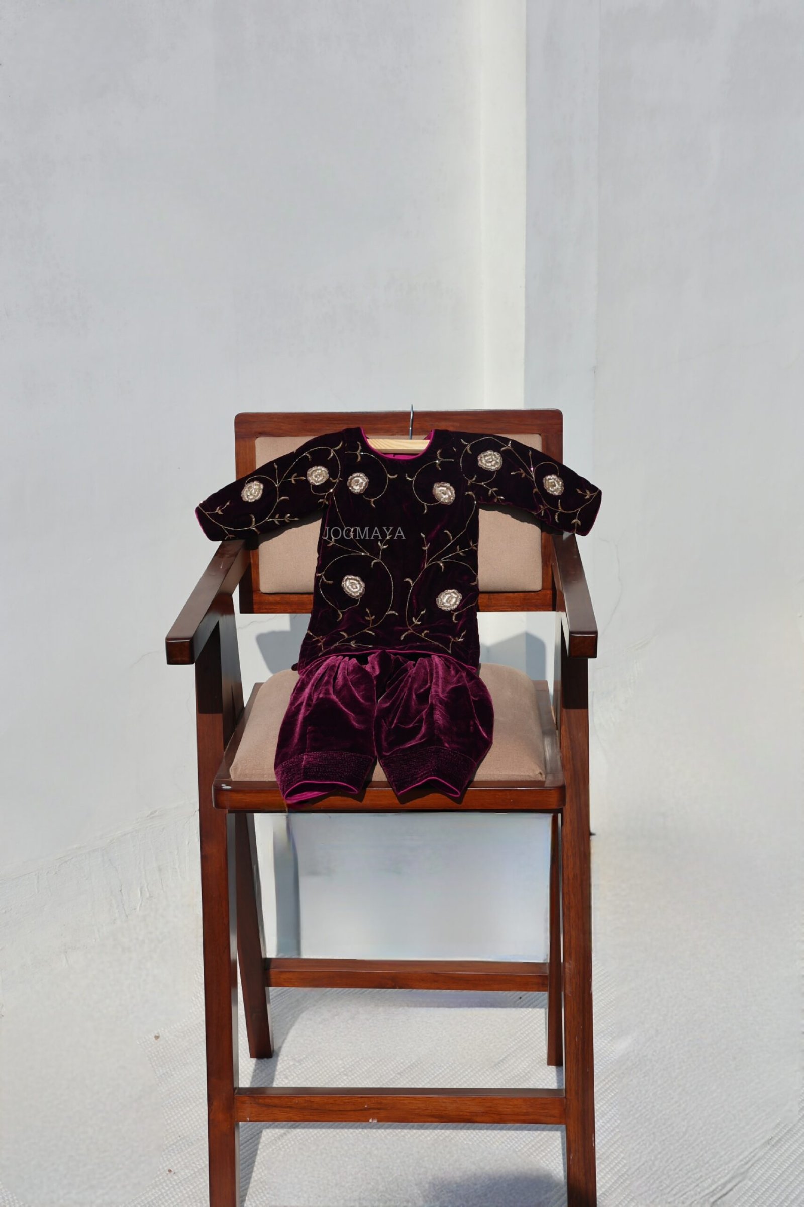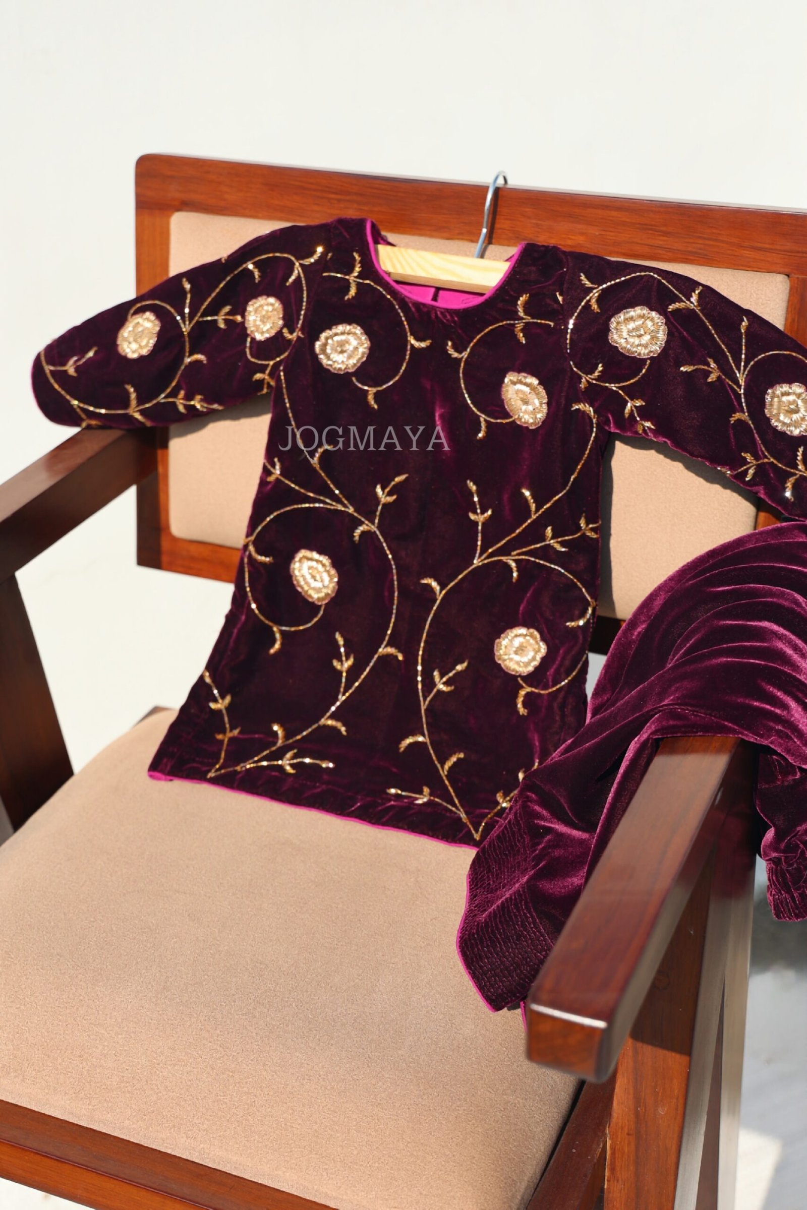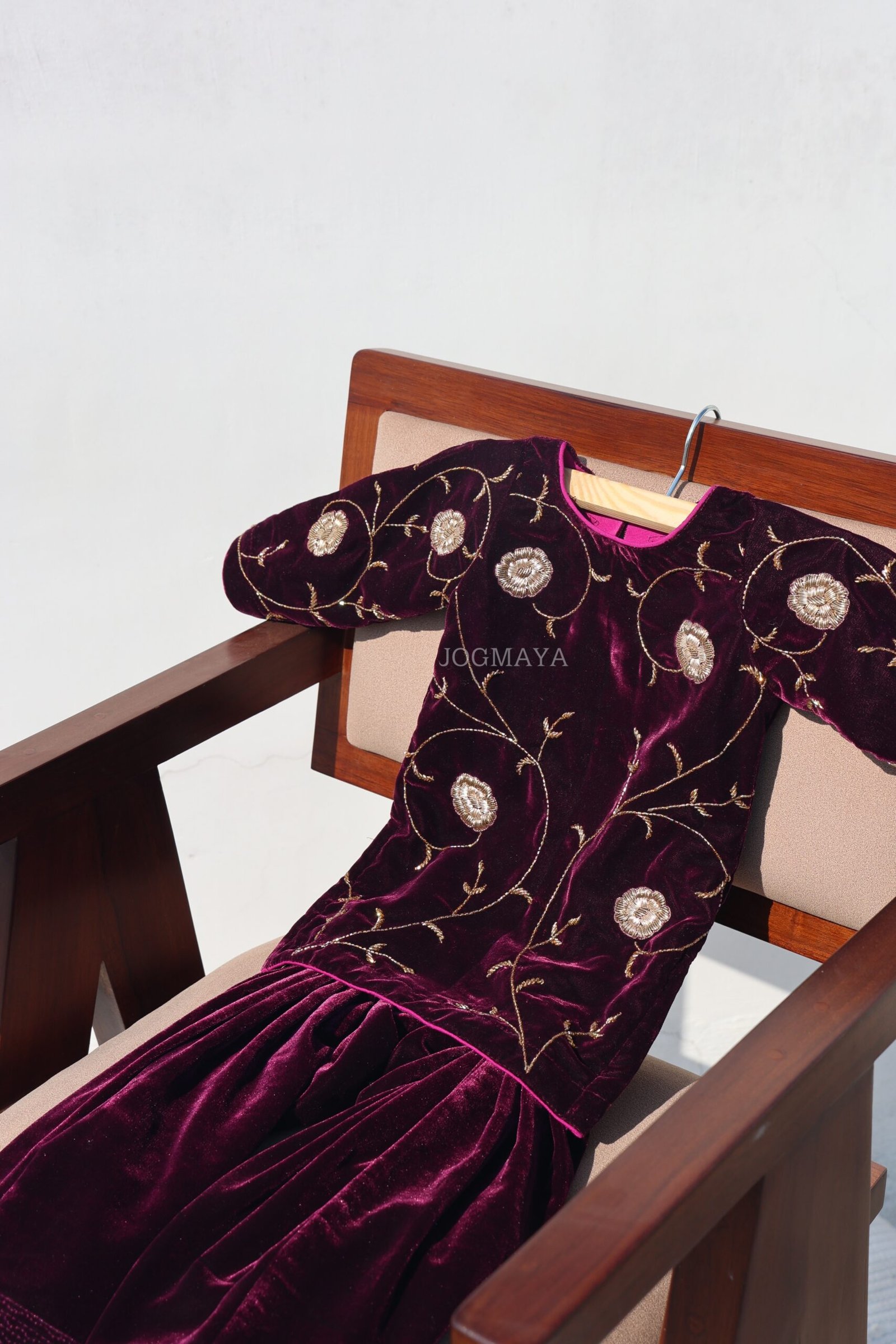 An exquisite plum velvet ensemble adorned with delicate golden zardosi vines. The tarangani Set embodies traditional grandeur soft to touch, regal in appeal, and perfect for weddings or festive occasions. Handcrafted with care, it’s where heritage meets youthful charm.